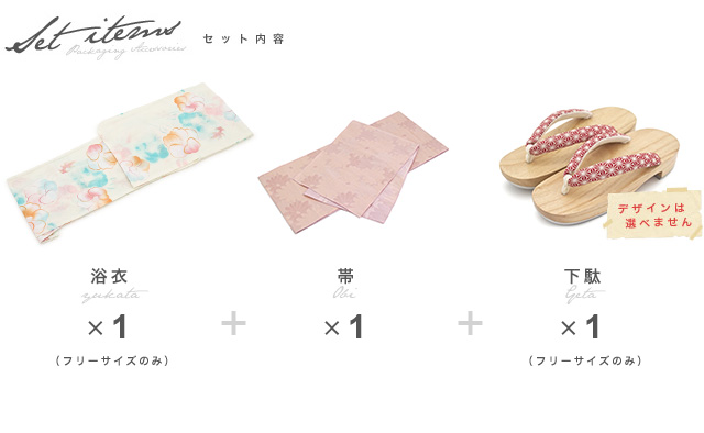 こちらの商品は、浴衣・帯・下駄の3点セットです。セット内容の一部変更や、それに伴う値引きは承っておりません。