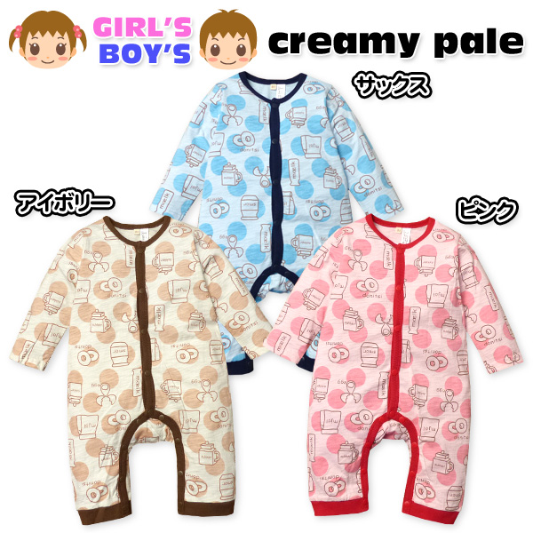 【送料無料】ベビー服 男の子 女の子 カバーオール 長袖 綿100% ドーナッツ柄 バックマチ付 前開きスナップボタン 男児 女児 ベビー【メール便対応】