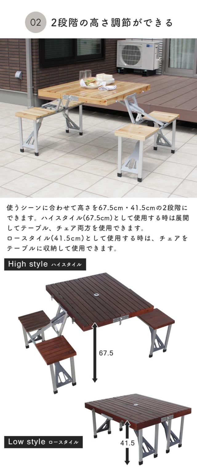 | テーブルとチェアが一体になったピクニックテーブル。 テーブルの中にチェアが収納でき、コンパクトに持ち運びができます。 脚部は軽くて丈夫なアルミ製。 チェアをテーブルの下へ入れれば、ローテーブルとしても使用できます。 パラソルもセットOK。 アウトドアに映える自然なナチュラルカラー。 天然木ならではの木の節があるので、1つ1つ違った印象に。 ※耐水性や耐油性があり、表面のキズを防ぐクリア塗装(ラッカー塗装)を施してあるため、開封時は臭いが強い場合がございます。 2〜3日程風通しの良いところに置いてからご使用下さい。 ※天然木を使用しているため、ささくれがある場合がございますのでご注意下さい。 |
