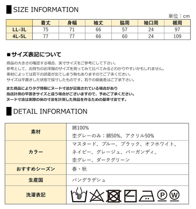 4L-5L:着丈77 身幅77 袖丈66 脇周60 袖口周24 裾周109