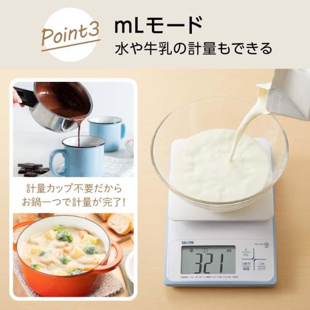 ●水や牛乳の量もはかれるmLモード付き。