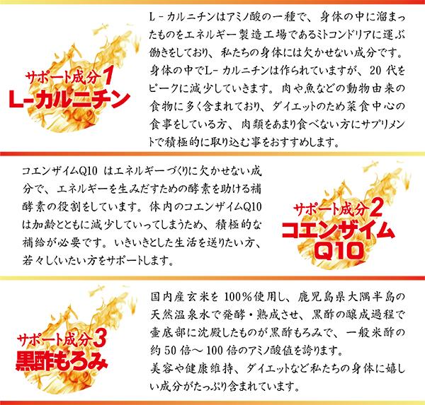 | 食用オリーブ油、ゼラチン、植物発酵エキス、黒酢もろみ乾燥粉末、L-カルニチンフマル酸塩、キャンドルブッシュエキス末、コエンザイムQ10、乳酸菌(殺菌)、デキストリン、グリセリン、ミツロウ、グリセリン脂肪酸エステル、マルトデキストリン、カラメル色素、(原材料の一部にゼラチン、りんご、大豆、やまいも、バナナ、ごま、オレンジ、カシューナッツ、キウイフルーツ、もも、小麦を含む) |