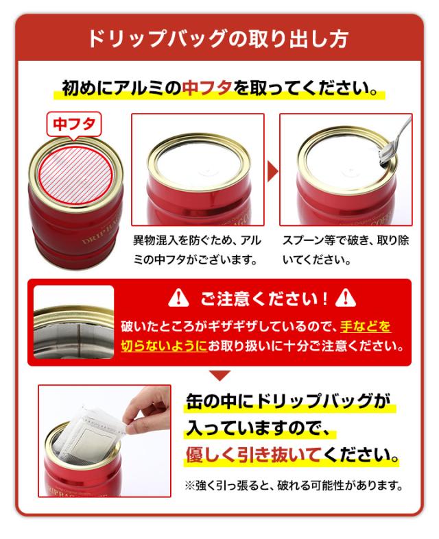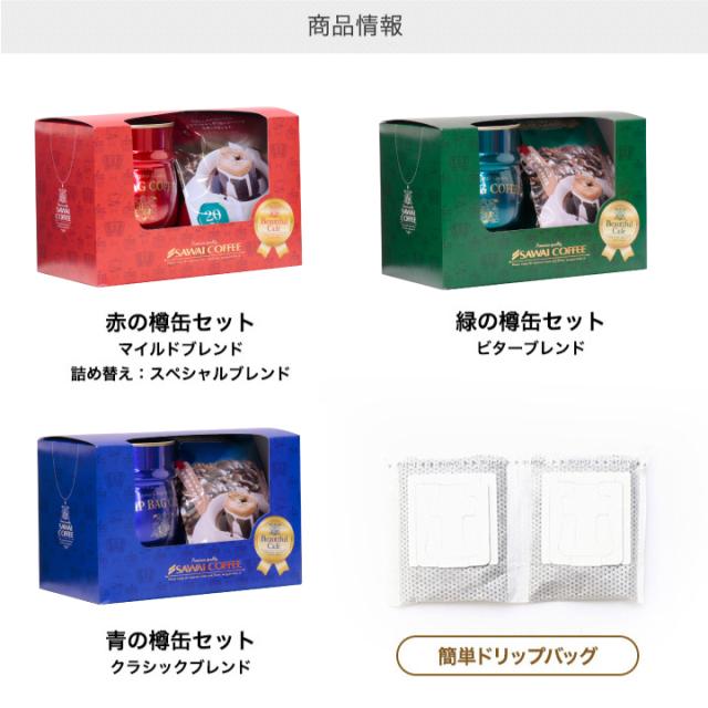 | 内容量 | ●赤の樽缶ドリップバッグセット ・赤の樽缶(直径約105mm×高さ約135mm)×1缶 ・スペシャルブレンド 8g×20袋 ・マイルドブレンド 8g×20袋 ●緑樽缶のセット ・緑の樽缶(直径約105mm×高さ約135mm)×1缶 ・ビターブレンド 8g×40袋 ●青樽缶のセット ・青の樽缶(直径約105mm×高さ約135mm)×1缶 ・クラシックブレンド 8g×40袋 |