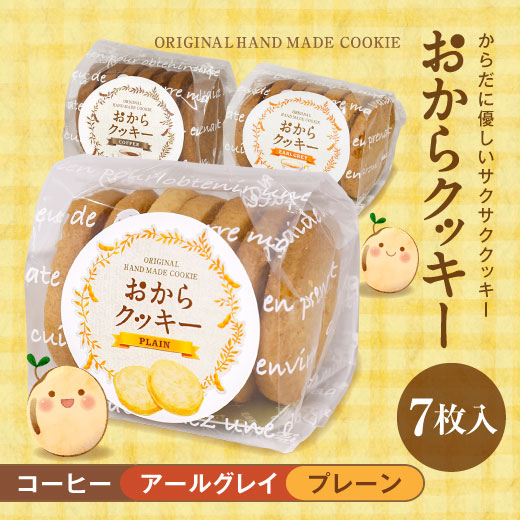 | 内容量 | ・おからクッキー(7枚入)×1袋 (味はコーヒー・アールグレイ・プレーンからお選びいただけます) ※1枚あたり約83kcal(糖質7.2g) |