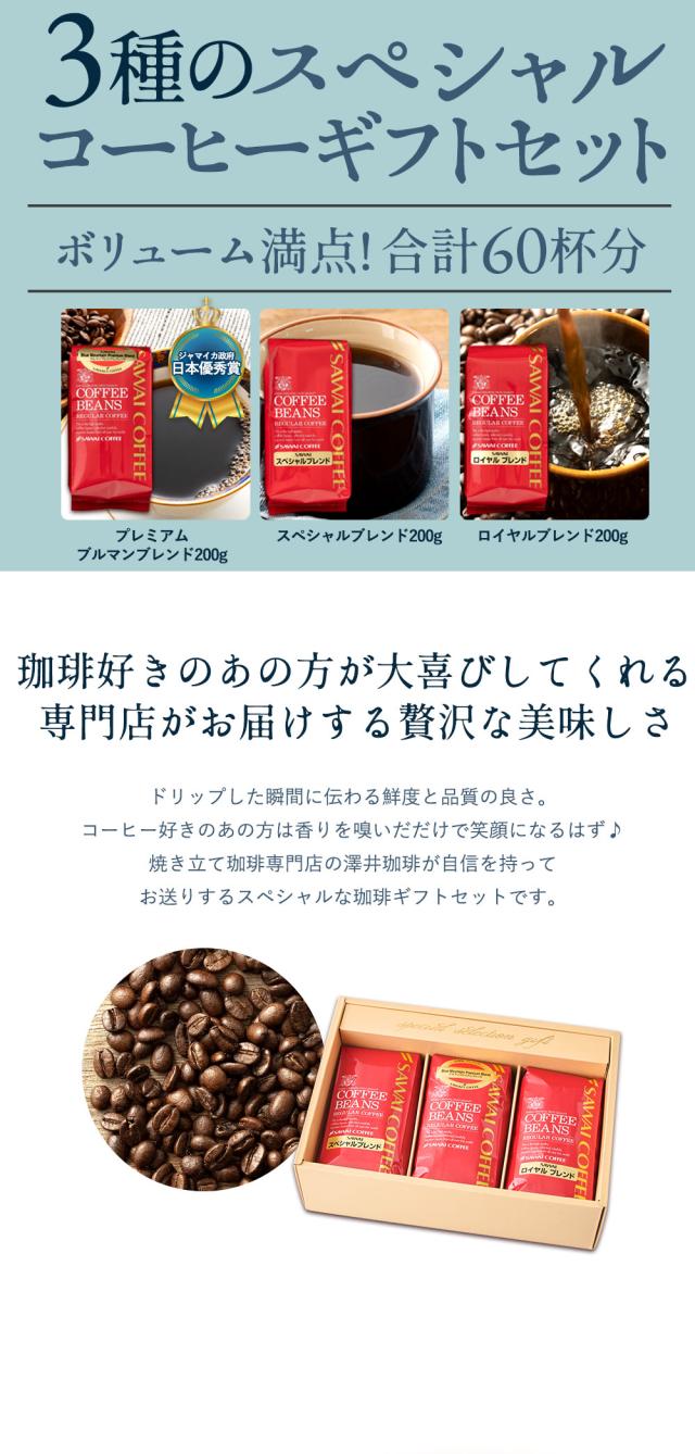 | 内容量 | ・プレミアムブルマンブレンド(200g×1袋) ・スペシャルブレンド(200g×1袋) ・ロイヤルブレンド(200g×1袋) |