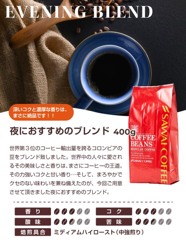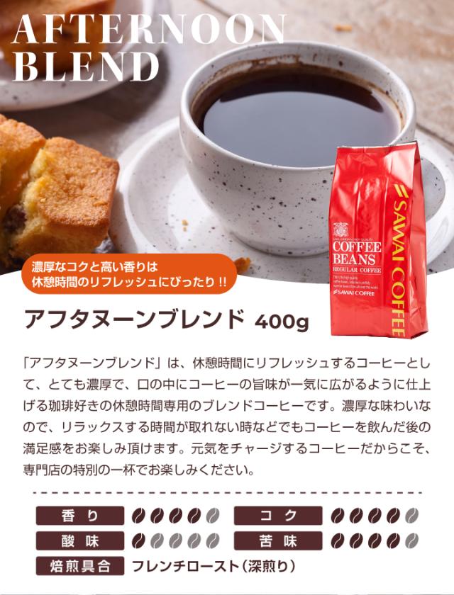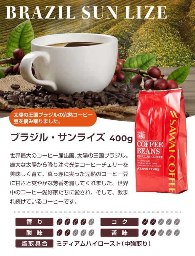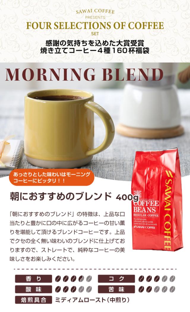 | 内容量 | ・朝におすすめのブレンド 400g×1袋 ・ブラジルサンライズ 400g×1袋 ・夜におすすめのブレンド 400g×1袋 ・アフタヌーンブレンド 400g×1袋 |