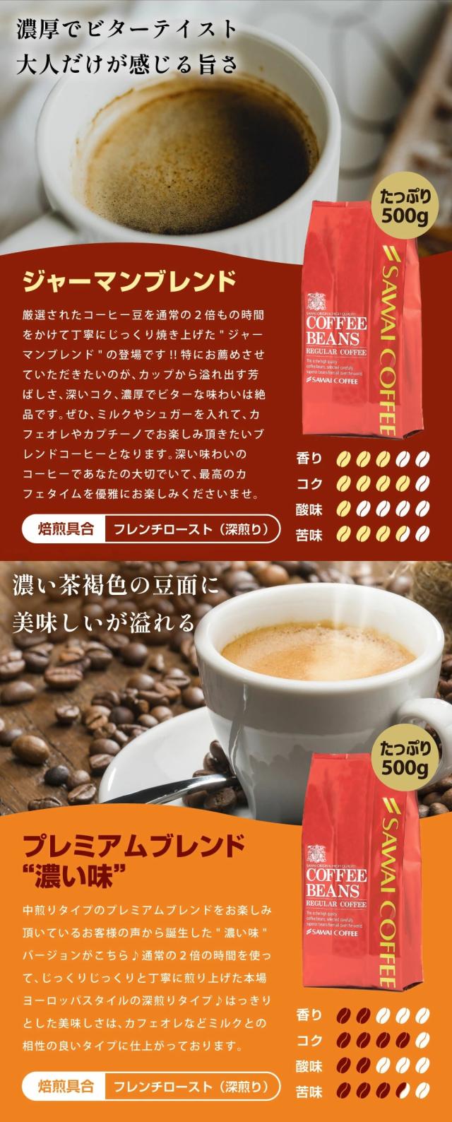 | 内容量 | ・エスプレッソブレンド 500g ・ジャーマンブレンド 500g ・プレミアムブレンド”濃い味” 500g |