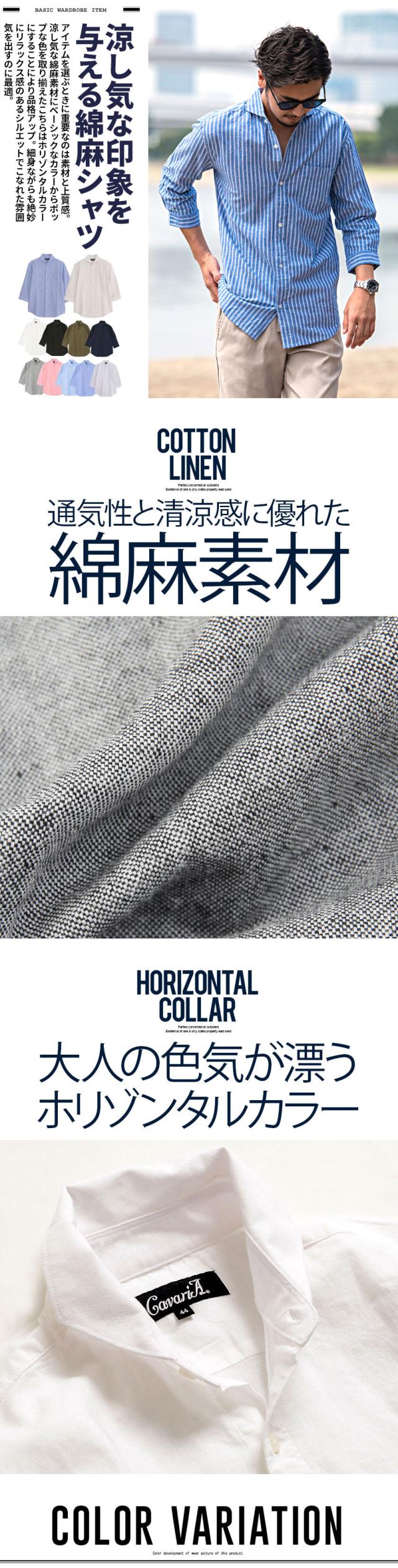 シャツ メンズ ブランド 大人 カジュアル ファッション 7分袖 七分袖 7分丈 七分丈 綿麻 麻シャツ トップス カジュアルシャツ 夏 春 シンプル 無地 ストライプ柄 白 黒 紺 ホリゾンタルカラー リネンシャツ ホワイト 白シャツ 白 ネイビー 紺ブ ラック 黒 ビジネス 父の日 父の日ギフト きれいめ きれい目 きれい目コーデ きれいめコーデ プレゼント 涼しい 清涼感 CavariA キャバリア 東京 プレゼント 贈り物 ギフト配送について
