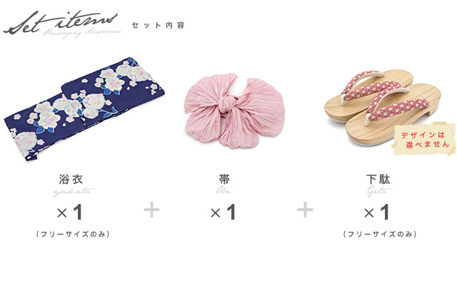 こちらの商品は、浴衣・帯・下駄の3点セットです。セット内容の一部変更や、それに伴う値引きは承っておりません。