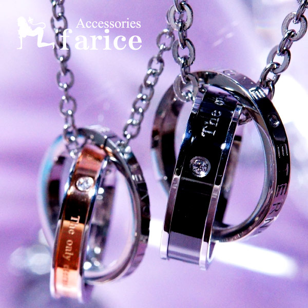 【ただ一つの永遠の愛】文字刻印入り クリアストーン装飾 ダブルリング ステンレス ペアネックレス【ピンクゴールド or ブラック】