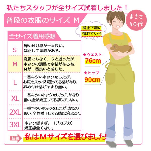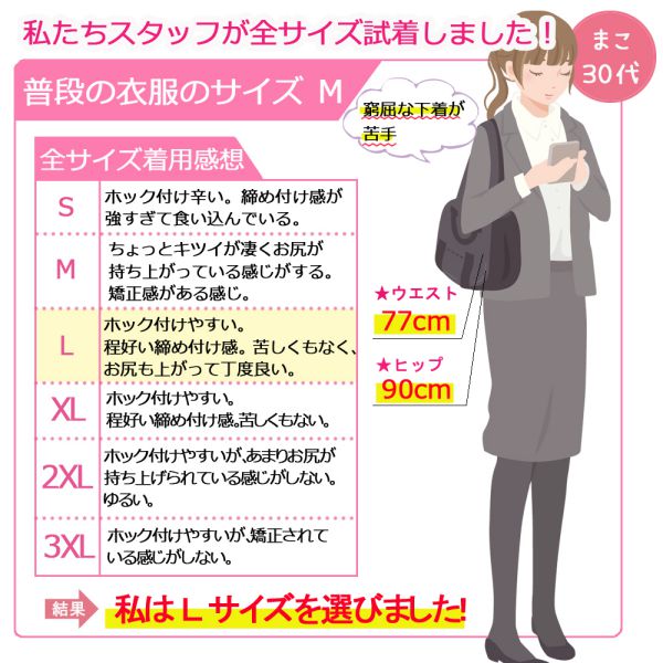 - 以前 購入させて頂いた時はMサイズでした。ですが、少しキツめだったので、今回Lサイズを購入しました。やっぱりラクですね。