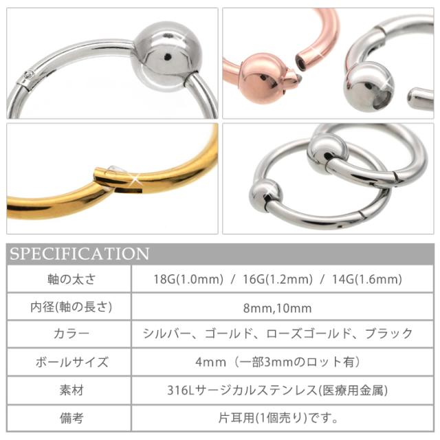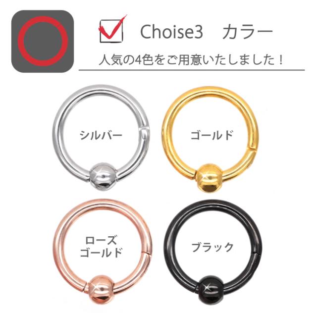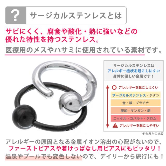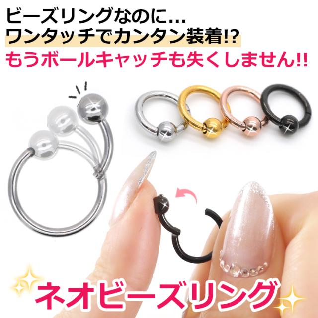 シンプル・イズ・ベストでかっこいいキャプティブビーズリングです。そんなキャプティブビーズリングの新商品「ネオビーズリング」が満を持して登場しました。皆様より寄せられた、長年のリングピアスのお悩みをバッチリ解消するアイテムです。取り外しはパチッとワンタッチで着けられるのでキャッチを失くす心配もありません。豊富なカラーバリエーションとサイズで、コーディネートにも幅がでます。ピアスの素材には、金属アレルギーでも安心の医療用素材"316Lサージカルステンレス"を採用。時間が経っても変色や変形しにくく、金属の輝きが色褪せません。