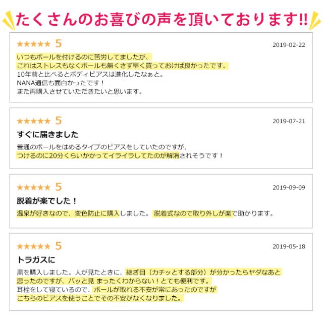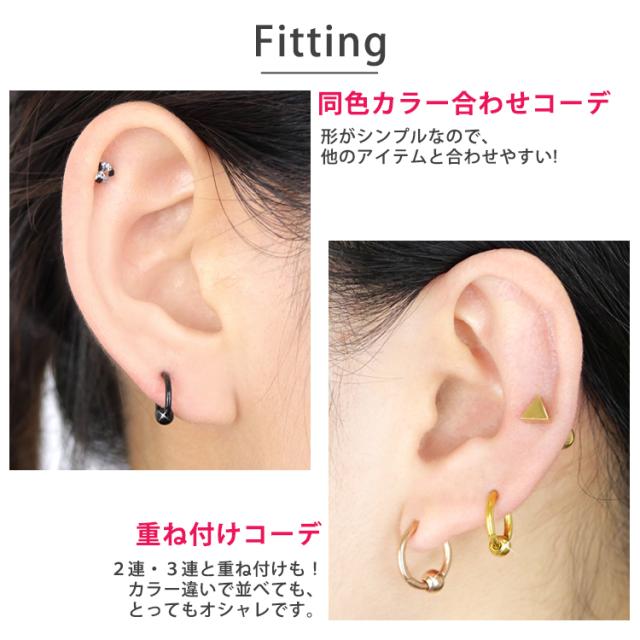 - 1つ売りと最初気付かず2つ購入しました。いつも面倒くさがりで入浴時にも外さないのでフープピアスを愛用していますが、今まで一度外してまた付けると止める所が緩むせいか落としやすくなりますが、こちらはボディ...