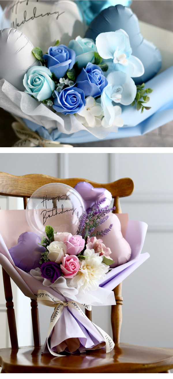 存在感のあるバルーンと、ソープフラワー・アーティフィシャルフラワー(造花)が組み合わさった、ふんわり軽やかな花束バルーンです。枯れずに長持ちし、お手入れ不要なのも魅力。