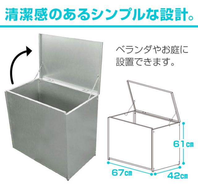 サビにくいガルバリウム鋼板を本体に使用したシンプルな外観で、おしゃれなお庭やベランダなどに設置しても景観を損ないません。上開きのふたが付いたボックスタイプで、カラスに荒らされる心配もありません。