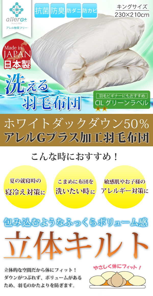 【安心の日本製羽毛布団】お手軽 羽毛掛ふとんホワイトダウンがたっぷり入った羽毛布団です。国内工場で羽毛の充填、縫製を行っているので、品質が高く、安心してお使いいただけます。CILグリーンラベルアレルG加工アレル物質低減とデオドラント効果、抗菌・防臭加工された羽毛を使用。商品サイズ(約/cm) 幅230×奥行210(キングサイズ) 中素材 ホワイトダウン50%、スモールフェザー50% 詰め物重量(kg) 約0.5 表 地 側生地/綿20%、ポリエステル80% キルト 6×5マス ダウンパワー 240cm3/g以上 商品サイズ(約/cm) 幅230×奥行210(キングサイズ) 中素材 ホワイトダウン50%、スモールフェザー50% 詰め物重量(kg) 約0.5 表 地 側生地/綿20%、ポリエステル80% キルト 6×5マス ダウンパワー 240cm3/g以上 ※無地/ベージュカラーとなりますが、多少生地の色目が変わる場合がございます。予めご了承ください。※こちらの商品は、手洗いで洗っていただけますが、完全に乾ききらないとニオイや品質低下の原因とな...