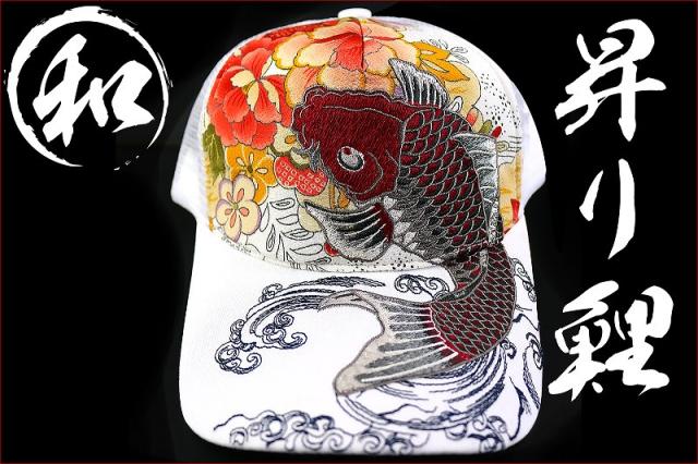 帽子68白 和柄ちりめんキャップ 波鯉刺繍 メッシュ縮緬悪羅悪羅系オラオラ系 ヤンキーチンピラちょい悪ヤクザ メンナク 悪党の店 バースジャパン BIRTHJAPAN