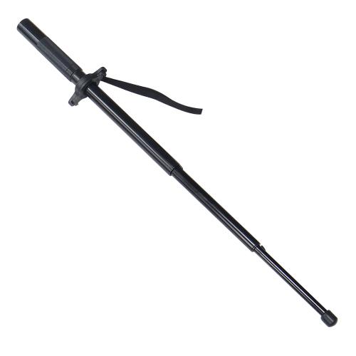 ロックピン式の鍔付の三段伸縮警棒で、グリップ部分にフラッシュライト搭載されております。ツバは回転式で十字にしたり、重ねて収納することができます。※地面に叩き付けての収納はできません