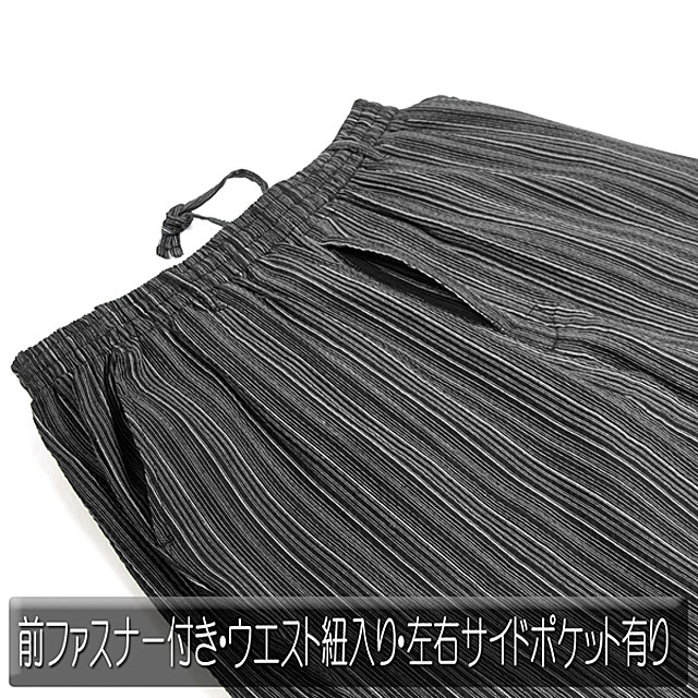 ・前開き、ファスナー付・ウエストは共ひも付きで引き絞って調節できます
