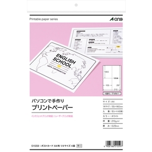 エーワン 51559 パソコンで手作りプリントペーパー 白無地 A4判 ポストカード 1/4サイズ 4面[51559] 返品種別A