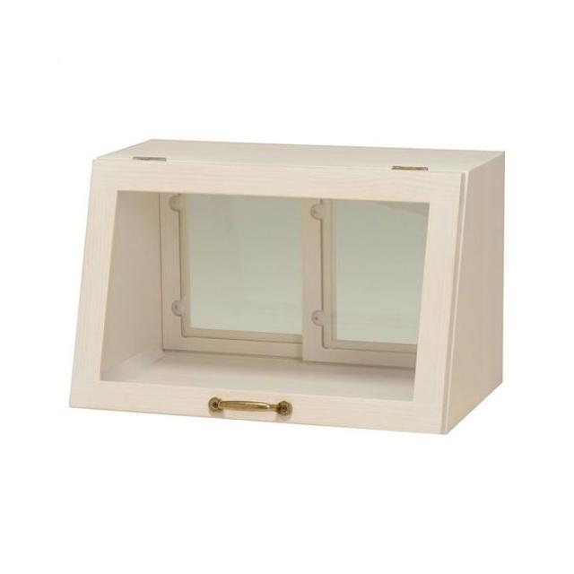 木の風合いが味わい深いカウンター上ガラスケース。表と裏で違う表情を見せる形状でディスプレイとしても活躍します。