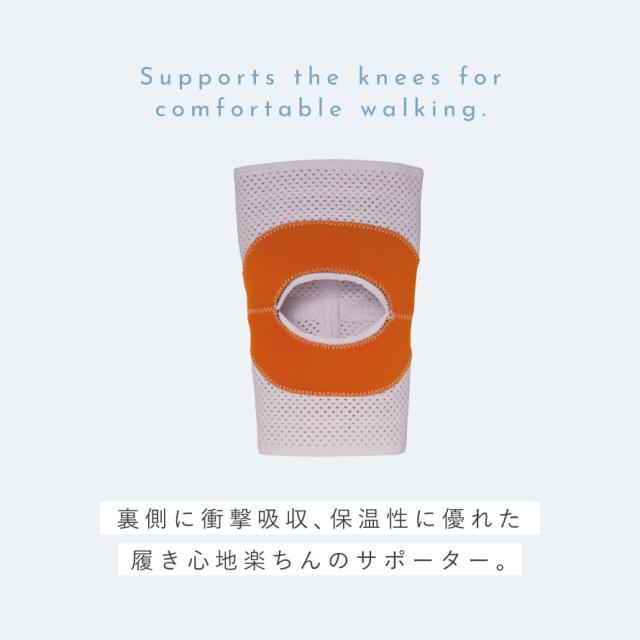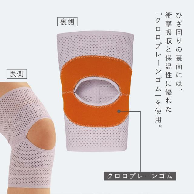 ひざ回りの裏面には、衝撃吸収と保温性に優れた「クロロプレーンゴム」を使用。しっかりひざ周りを安定させ衝撃を吸収するので、ひざの曲げ伸ばしが楽ちんです。「ガクッ」とくるひざの関節をクロロプレーンゴムがしっかり被い、安定してくれます。