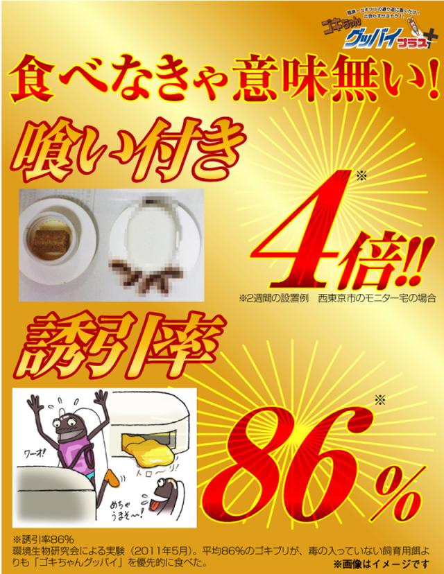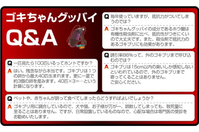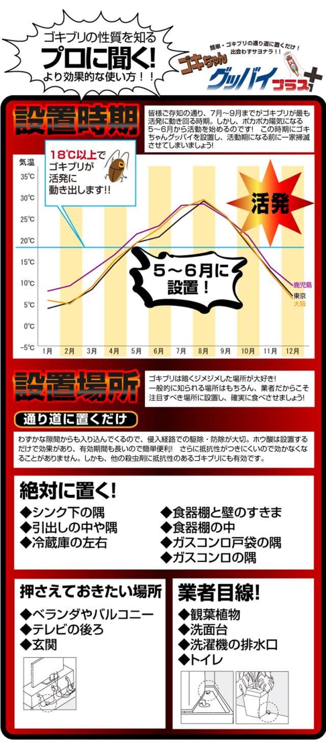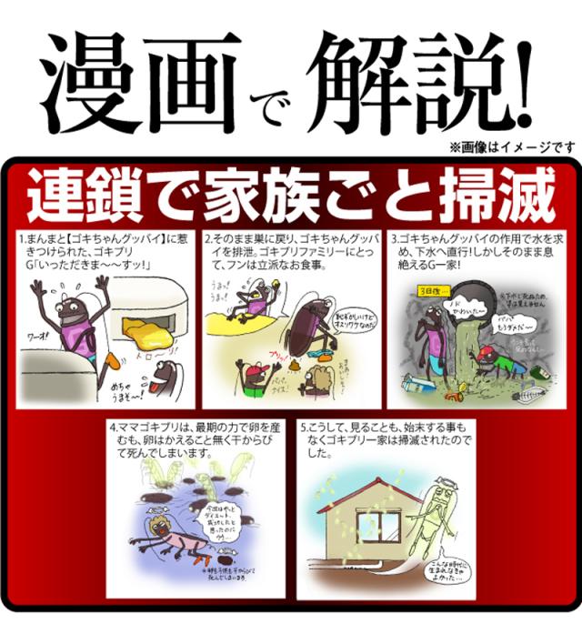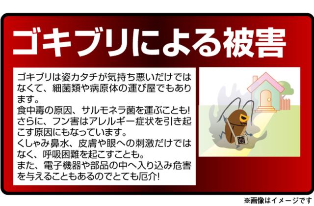 | 注意事項 | ●本品はホウ酸を含有する製剤です。 ●定められた使用法、使用量を守って下さい。 ●誤飲防止のため、容器から薬剤を取り出さず、容器のままご使用ください。 ●小児やペットなど誤って食べる事のない様、食品・食器・飼料などと区別して保管してください。 ●人体に使用しないこと ●万一、誤って食べた場合は、すぐに吐き出させ、直ちに本品がホウ酸を含む製剤であることを医師に告げ、治療を受けてください。 ●薬剤が手、皮ふなどに触れた時は、石ケンでよく洗ってください。 ●本品の効力は、設置後約6ヶ月ですが、ゴキブリの生息数や種類によって異なります。 ●様々な所に設置できる両面テープ付属。 |