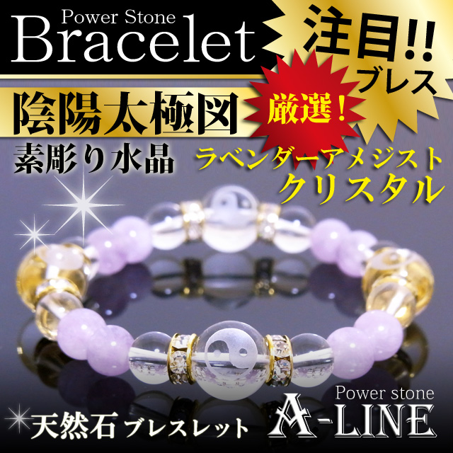 パワーストーン ブレスレット 素彫り陰陽太極図水晶12mm&ラベンダーアメジスト&水晶8mm PW-2968