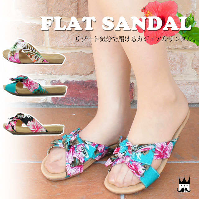 レディース(女性用) 3217 リゾートサンダル リゾート サンダル ハイビスカス フラット フラットサンダル リボン ボタニカル柄 バンダナ