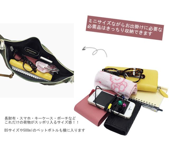 ミニサイズながら長財布・B5サイズ・500mlのペットボトルもOKでお出掛けに必要な必需品はきっちり収納できます。