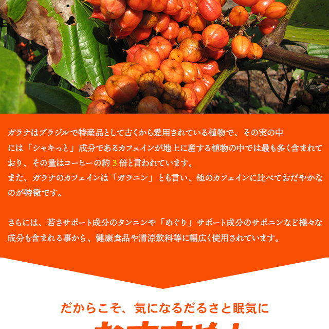 | 原材料 | デキストリン(国内製造)、ガラナ末(国内製造)/ゼラチン |