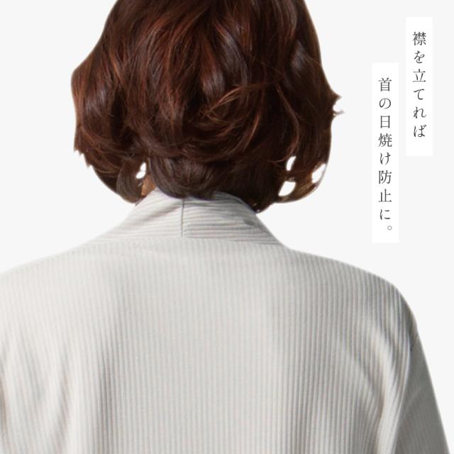 ヒップまで隠れる丈で、気になる体型もカバーしてくれるのも嬉しい。 衿を立てれば首焼け防止に。