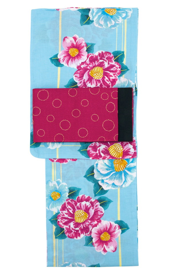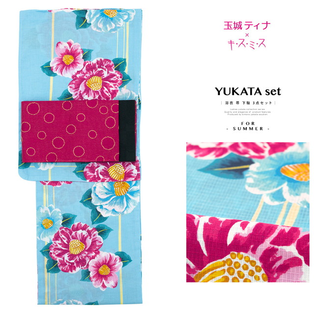 浴衣セット レディース レトロ 浴衣セット 大人 3点セット 水色 ブルー ピンク 椿 ツバキ 花 綿 女性 玉城ティナ キスミス