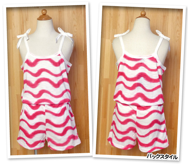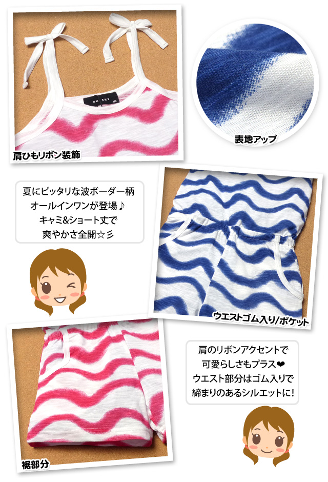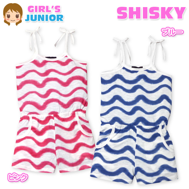 子供服 女の子 オールインワン サロペット 半袖 SHISKY シスキー 波ボーダー柄 肩リボン ショート丈 女児 ジュニア
