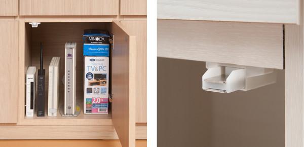 | 便利な配線穴付き 下段の扉内にはそれぞれ配線穴付きです。ごちゃついた配線周りもスッキリまとめることができます。 | 金具が隠れるスライド蝶番使用 扉の内側に蝶番がついているので外からは金具などが見えないようになっています。 |