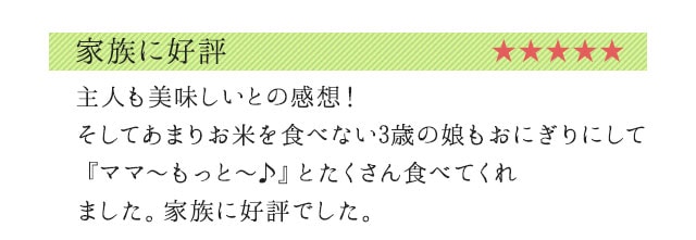 家族団らんに欠かせない影の主役、それがご飯です。 ほんわか香り漂うコシヒカリを囲って食卓を楽しみませんか? 炊き上がると一粒一粒がしっかりしていて、噛めば噛むほどお米の甘みがふわ〜っと口いっぱいに広がります。 炊き立てはもちろん冷めても美味しいお米です!!