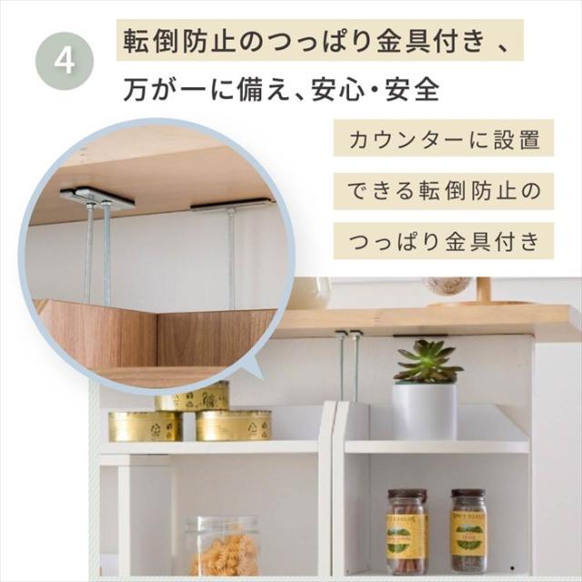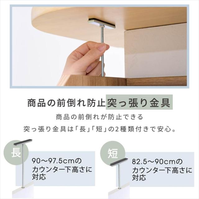 カウンター下使用時には、高さに合わせて2種類の突っ張り棒が付属されているのでしっかり固定可能で薄型でも前倒れの心配もありません。