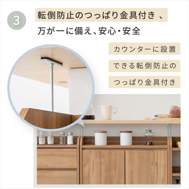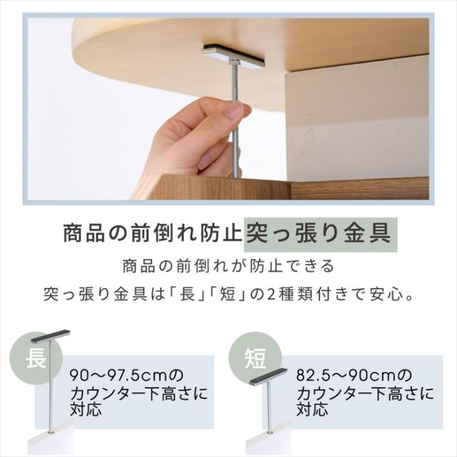 カウンター下使用時には、高さに合わせて2種類の突っ張り棒が付属されているのでしっかり固定可能で薄型でも前倒れの心配もありません。