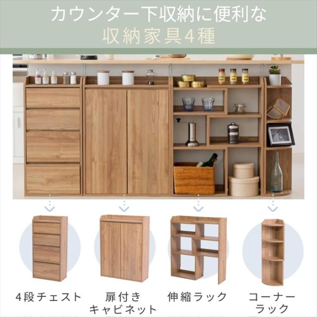 | 【カウンター下収納シリーズ】 ● 4段チェスト ● 扉付きキャビネット ● 伸縮スライドラック ● コーナーラック ● 組み合わせフルセット ※このページは[カウンター下収納 扉付きキャビネット]を販売しております。 |