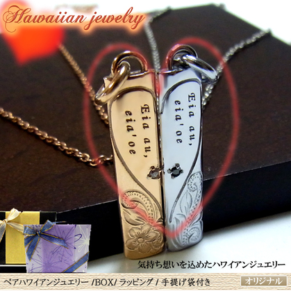 送料無料 刻印無料 ペアハワイアンジュエリー プレート ペアネックレス ステンレス ピンクゴールド BOX付き ラッピング対応 アレルギー対応