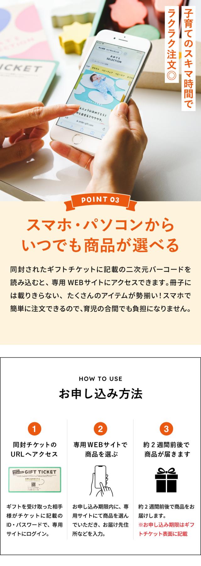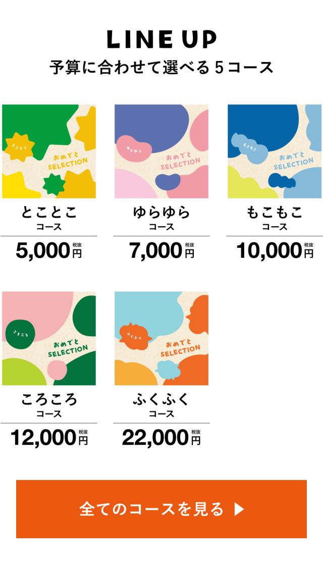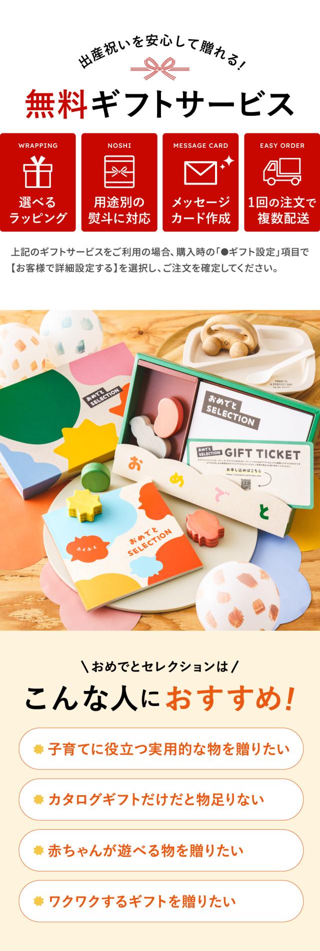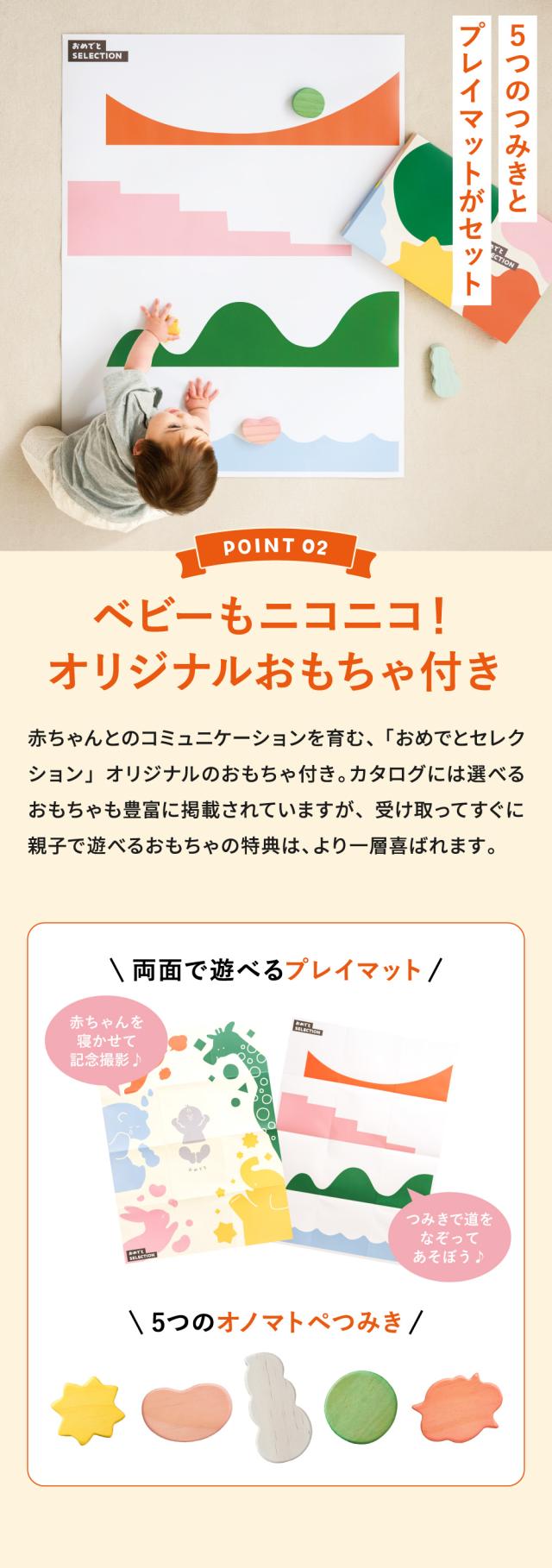 出産祝いや、ベビーのお誕生日プレゼントに人気のカタログギフト「おめでとセレクション」。定番のベビー用品から最新トレンドのアイテムまで、子育てに必要なものを幅広く掲載。さらに、オリジナルのおもちゃ付きで知育遊びも楽しめます。赤ちゃんと家族みんなが喜ぶ、出産祝い専用のカタログギフトです。 |