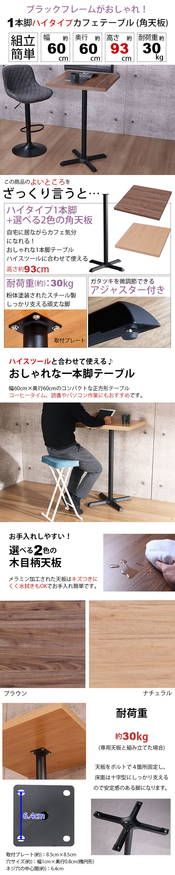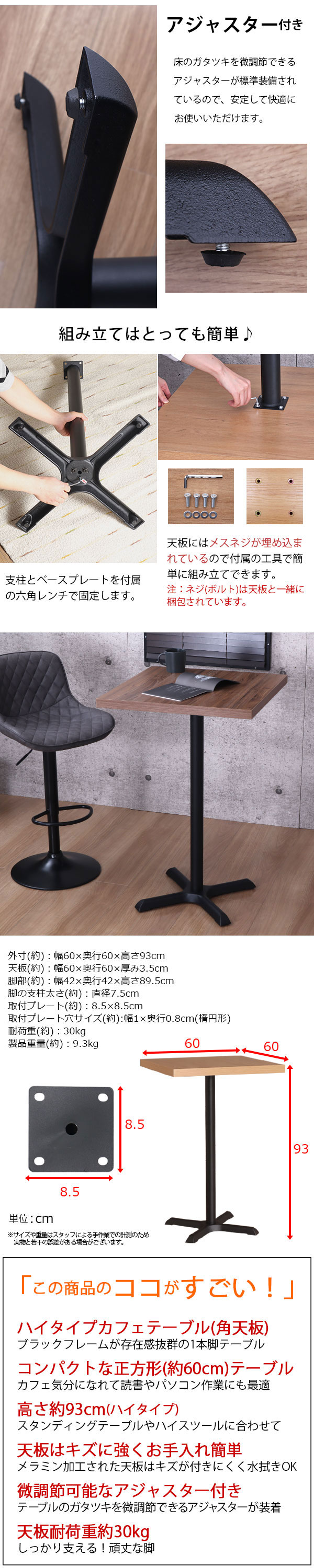 カフェテーブル ハイタイプ 正方形 60×60 一本脚 カウンターテーブル カフェ風 テーブル おしゃれ ハイテーブル サイドテーブル パソコンテーブル ワークテーブル コンパクト ブラックスチール脚 クロス脚 幅60cm 奥行60cm 高さ93cm ブラウン ナチュラル アジャスター付き