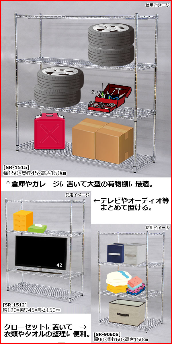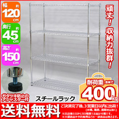 『(S)スチールラック 幅150cm 奥行き45cm 高さ150cm(4段)』メッキ 送料無料 ガレージ収納 リビング収納 パントリー収納 (SR-1515)