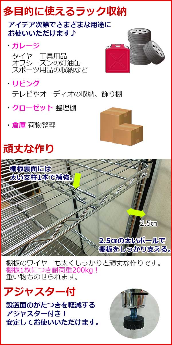 | 様々な用途に使えるラック収納です。使い道はアイディア次第で無限大! ・ガレージや倉庫ではタイヤや灯油缶など大型で重量のあるものも置けちゃいます。 ・リビングでテレビやオーディオ類をまとめて設置することも可能です。 ・クローゼットに置いて衣類やタオルの整理に使っても便利。 ・その他、飾り棚にしたり荷物整理などにもどうぞ♪ |
