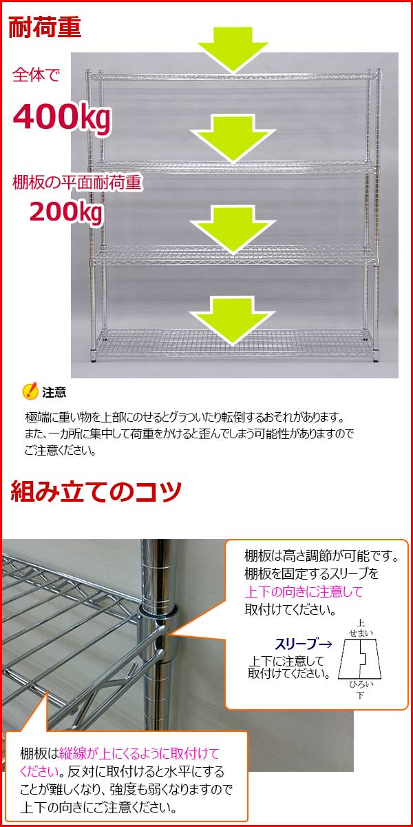 | 平面耐荷重 棚板:約200kg 全体:約400kgまで |