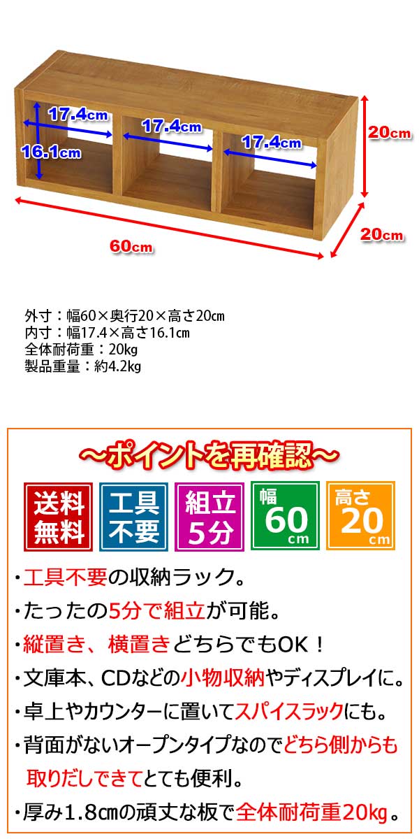 外寸:幅60cm 奥行き20cm 高さ20cm(60×20×20)
