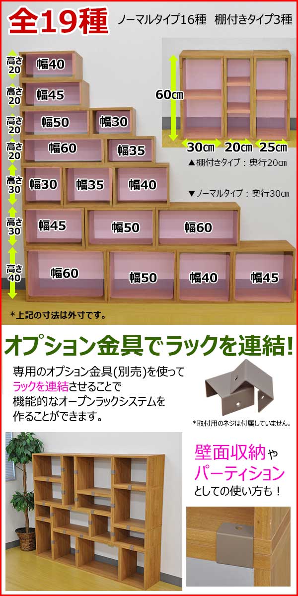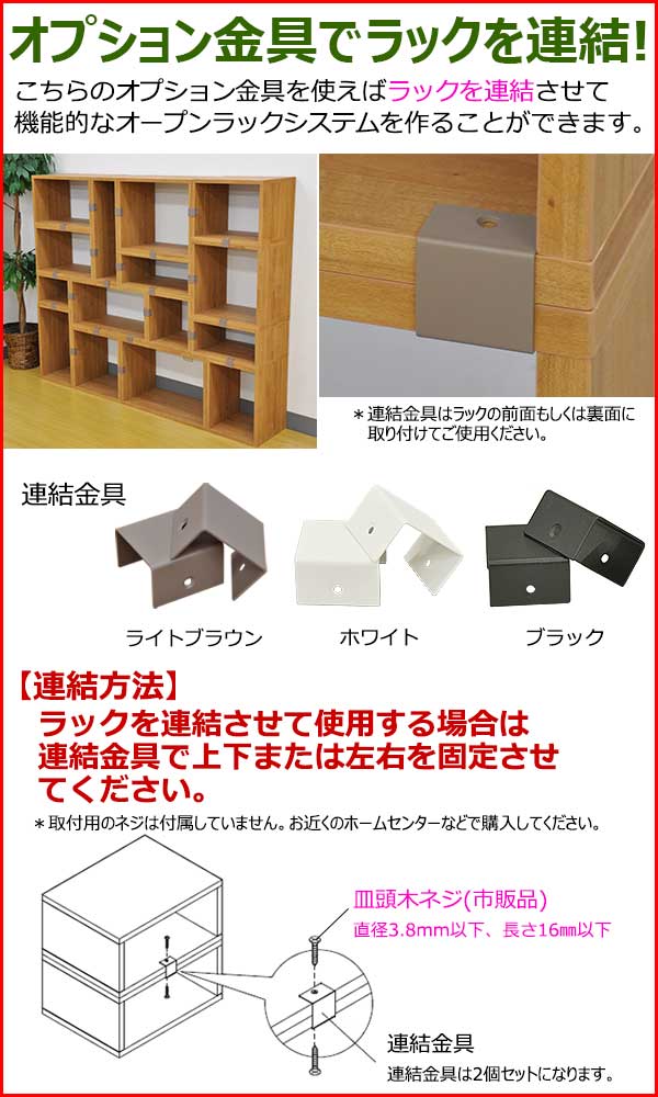 オープンラックシステム用の連結金具です。 ※2個セットでの販売です。 ※連結金具取り付け用のネジは付属しておりません。 お近くのホームセンターなどでお買い求めくださいませ。 推奨ネジサイズ:直径3.8mm 長さ16mm (皿頭木ネジ) |