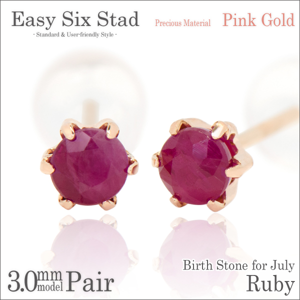 ルビー ピアス 送料無料 K10 ピンクゴールド 3mm 薄型6本爪 スタッド 両耳ペア