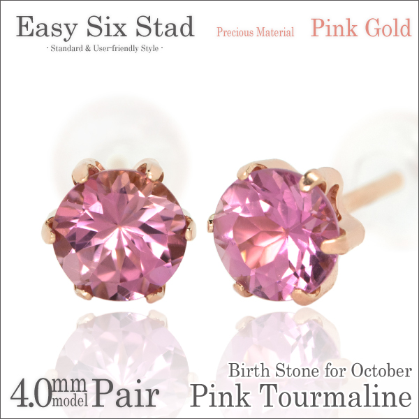 ピンクトルマリン ピアス 送料無料 K10 ピンクゴールド 4mm 薄型6本爪 スタッド 両耳ペア