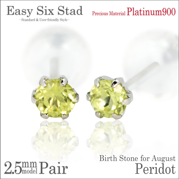 ペリドット ピアス 送料無料 Pt900プラチナ 2.5mm 薄型6本爪 スタッド 両耳ペア